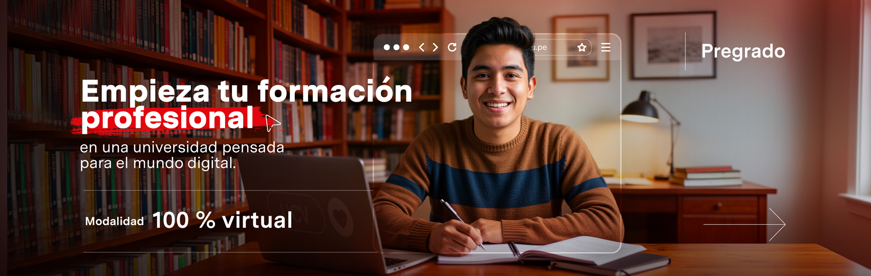 Tu historia profesional empieza con una decisión. Estudia en modalidad 100% virtual y avanza en tu formación universitaria, estés donde estés.