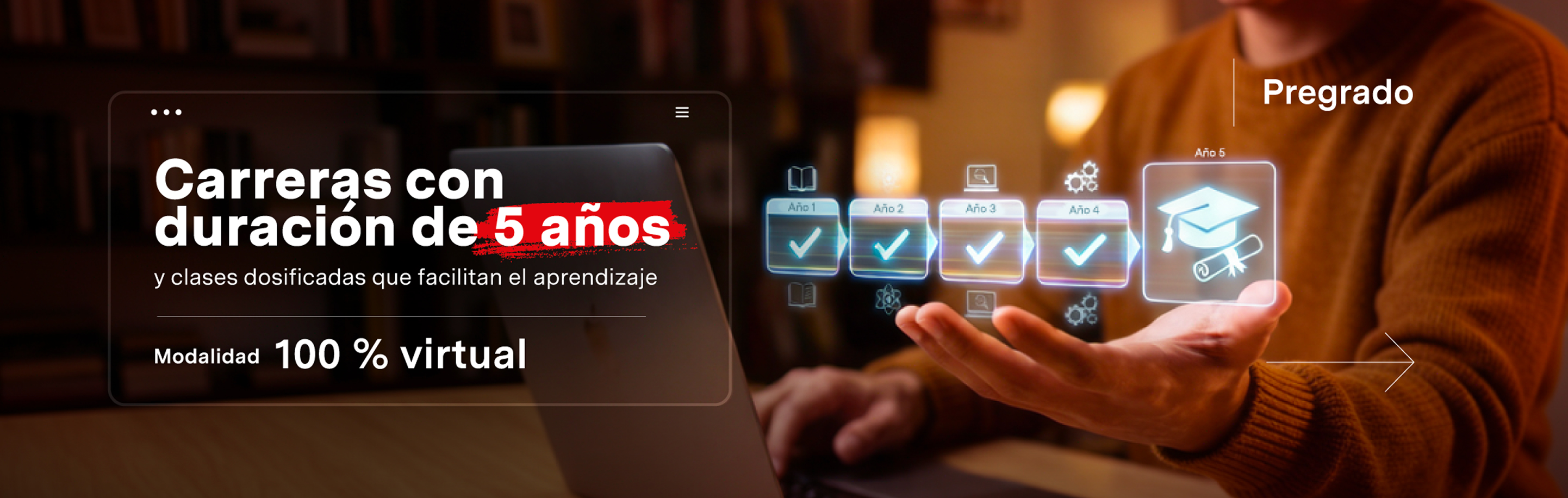 Empieza hoy tu carrera de pregrado virtual, con clases dosificadas, acompañamiento académico constante y un modelo diseñado para llevarte hasta tu título profesional.